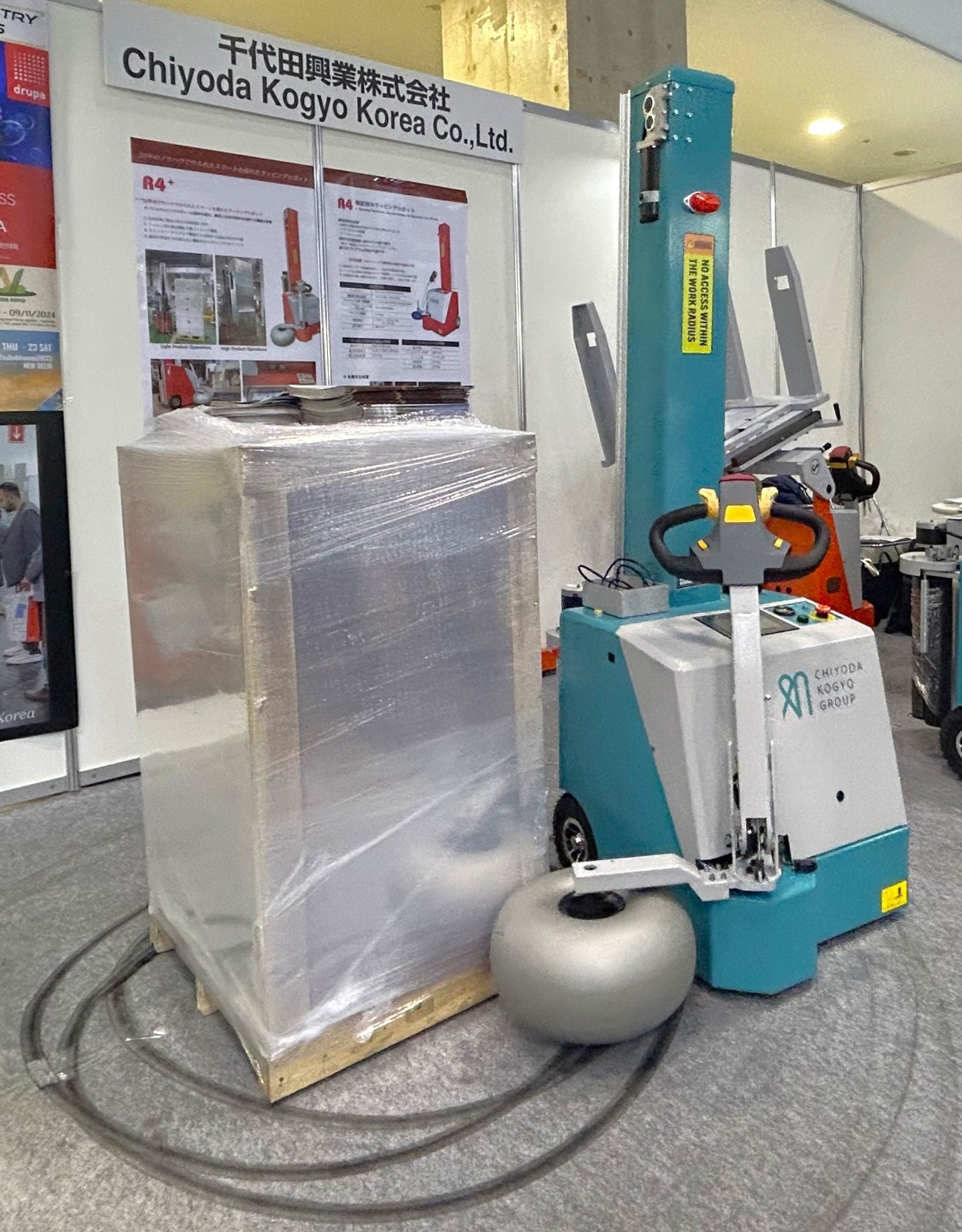 今回、弊社は韓国のグループ企業であるChiyoda Kogyo Korea Co., Ltdと共同で参加し、自走式ストレッチフィルムロボット「ラピロ」を展示させていただきました。当製品はパレットに積まれた荷物の周りをロボットが自走しながらストレッチフィルムを巻き上げるというものです。荷物のサイズや高さをセンサーで自動で認識するため汎用性があり、省人化に役立ちます。韓国のメーカーより輸入している製品で、同国をはじめインドネシアや日本国内で広く販売しております。